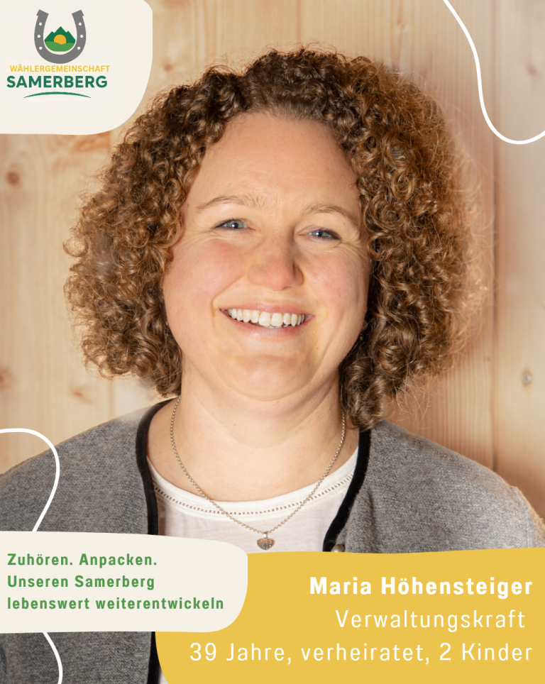 Als gebürtige Samerbergerin ist es mir wichtig, mich aktiv in die Gestaltung unserer Gemeinde einzubringen. Ich möchte zuhören und ins Gespräch kommen um gemeinsam Lösungen zu finden, damit der Samerberg für alle Generationen lebenswert bleibt und sich weiter positiv entwickelt.